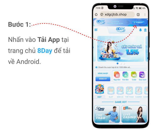 Buóc 1: Nhẩn vào Tải App tại trang chủ 8Day đế tải về Android