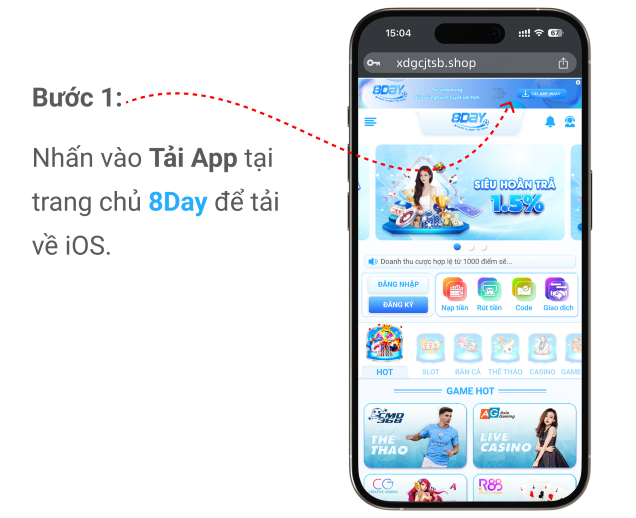 Buóc 1:Nhẩn vào Tải App tại trang chủ 8Day đế tải về iOS